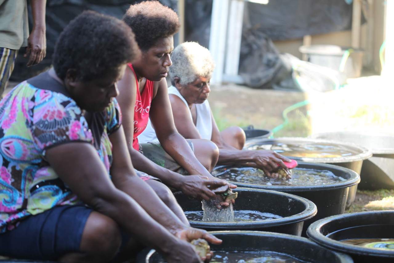 Cleaning green kava that has just been received. After cutting, the kava is carefully brushed to remove impurities.