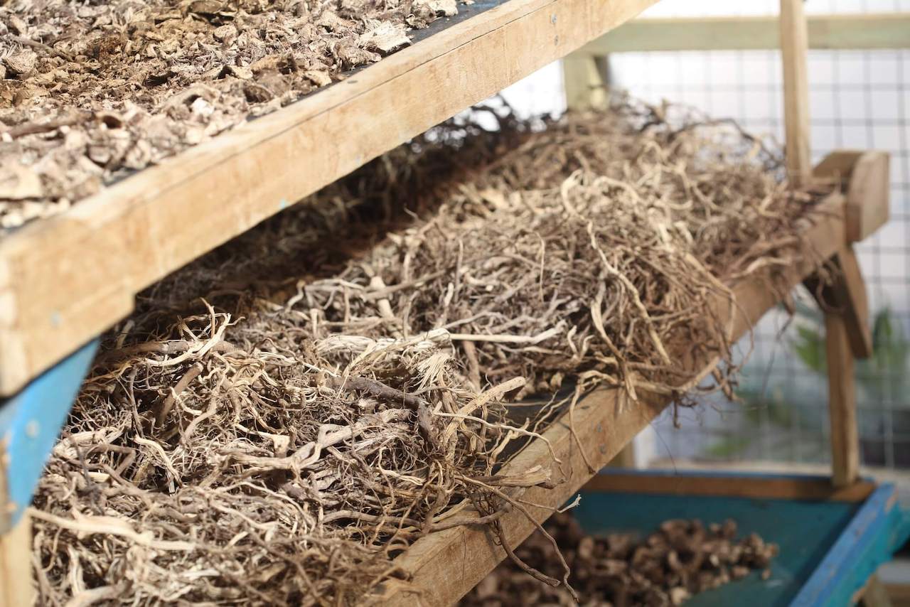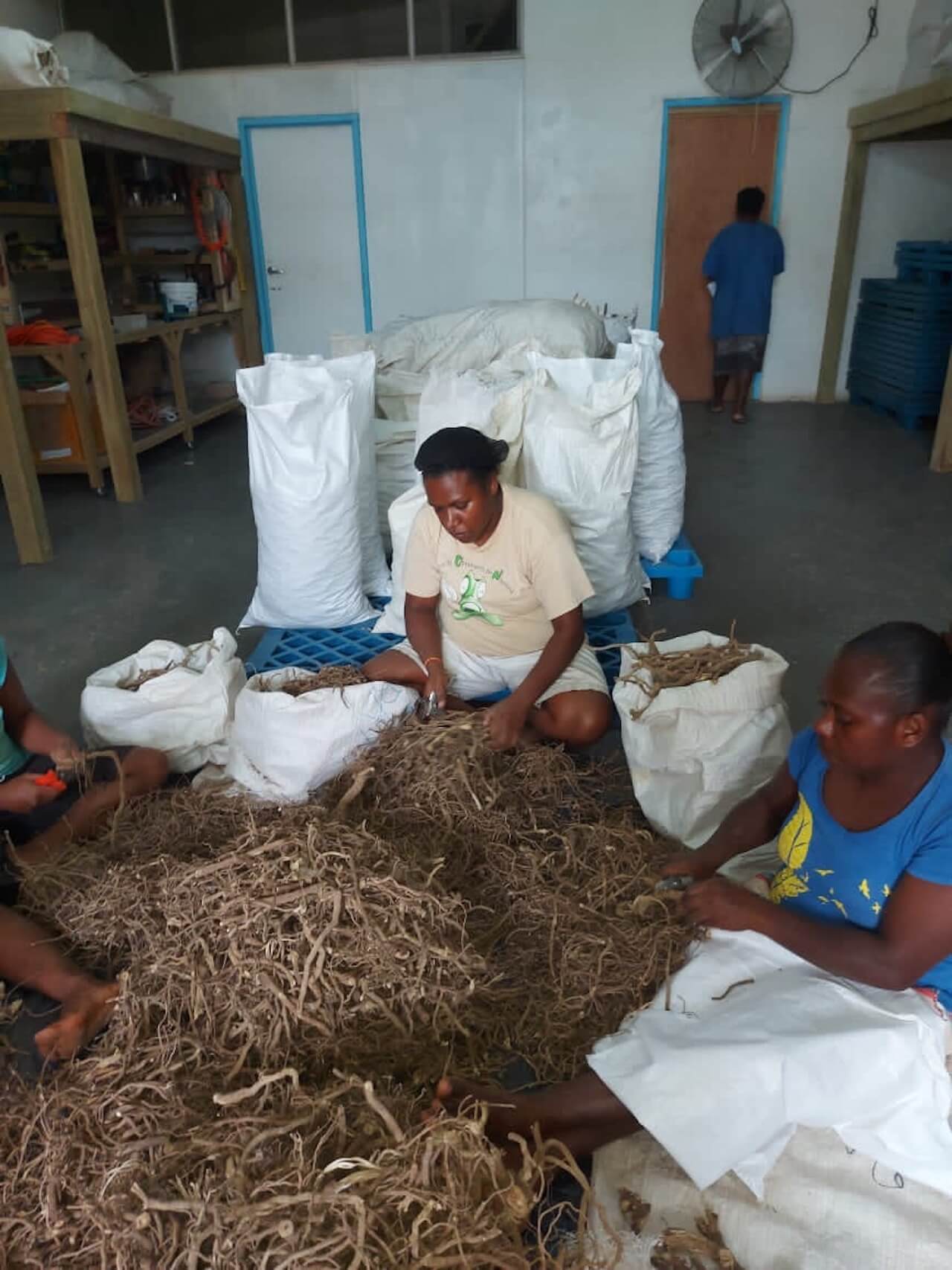 Reception and manual sorting of kava roots, note that only selected noble kava is taken into account. The roots are then carefully washed before drying process.